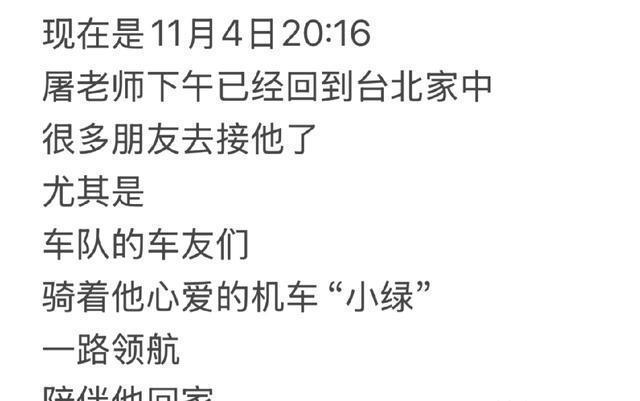 合作伙伴透露,11月4日下午,屠颖已经回到台北的家中,很多朋友都赶过去接他。车队的队友们,骑着他心爱的机车,一路领航,陪伴他回家。