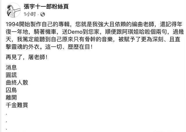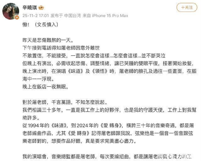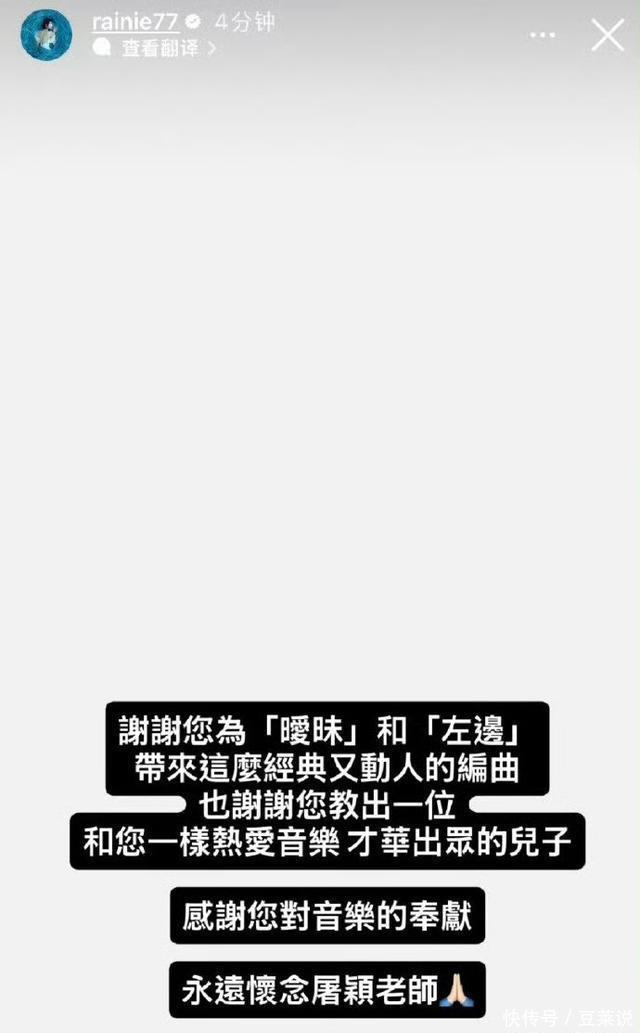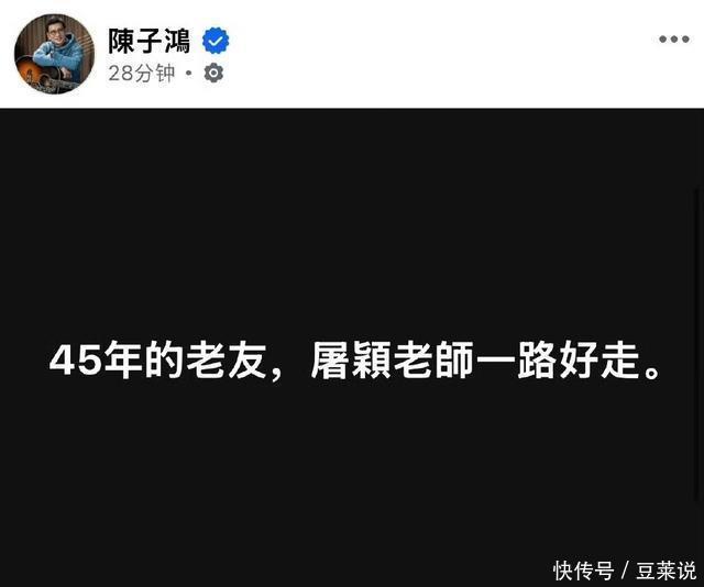这一消息由台湾制作人陈子鸿于当日傍晚率先证实,他悲痛写道:“45年的老友,屠颖老师一路好走。”