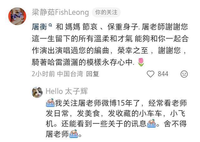 梁静茹现身评论区安慰屠衡,愿他和妈妈节哀保重身体。