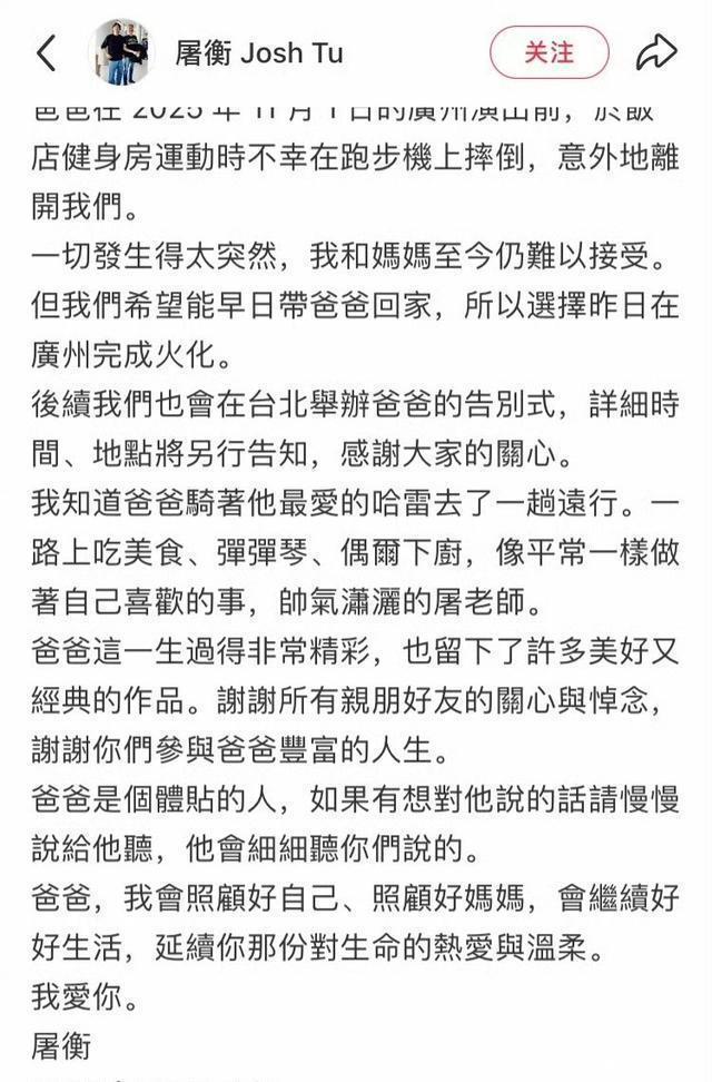 11月4日晚,屠颖的儿子屠衡发长文悼念父亲,他悲痛称一切发生太突然,和妈妈至今仍难以接受。 他的字里行间都是对父亲的不舍,一看就是一位懂事孝顺的暖男,让人看了泪目。屠衡还透露11月3日爸爸已经在广州火化,后续将在台北举办告别式。